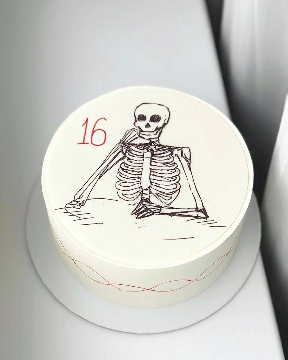 Торт с изображением скучающего скелета.